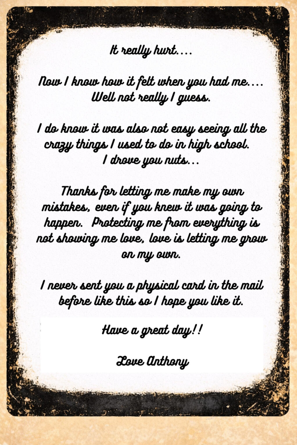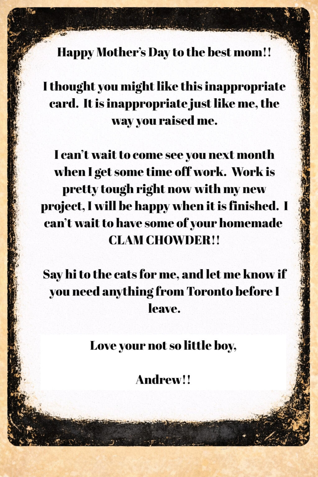 Thank you very much for getting this far.We now have all the information we need to make your awesome card.We will mail all Mother's Day cards on May 1st, 2026 to the Canadian address given. If you placed your order after that date, we will send it out the next business day.Our time together is almost done, it is time now for the awkward part. Time to hand over your hard earned money!!